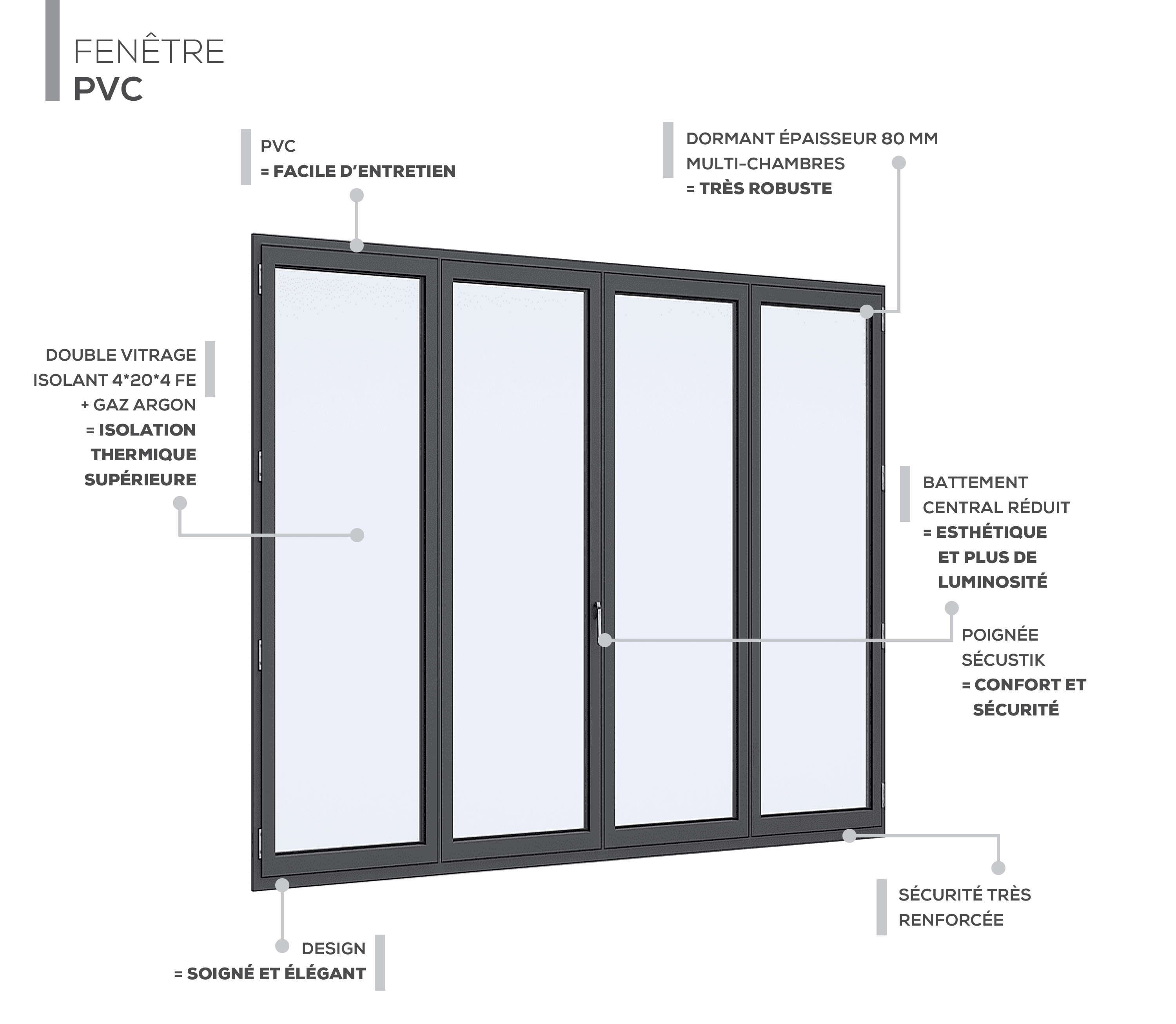 - Vitrage : Double vitrage de 28mm avec traitement ITR (Isolation Thermique Renforcée) et intercalaire warm-edge pour une performance énergétique accrue.