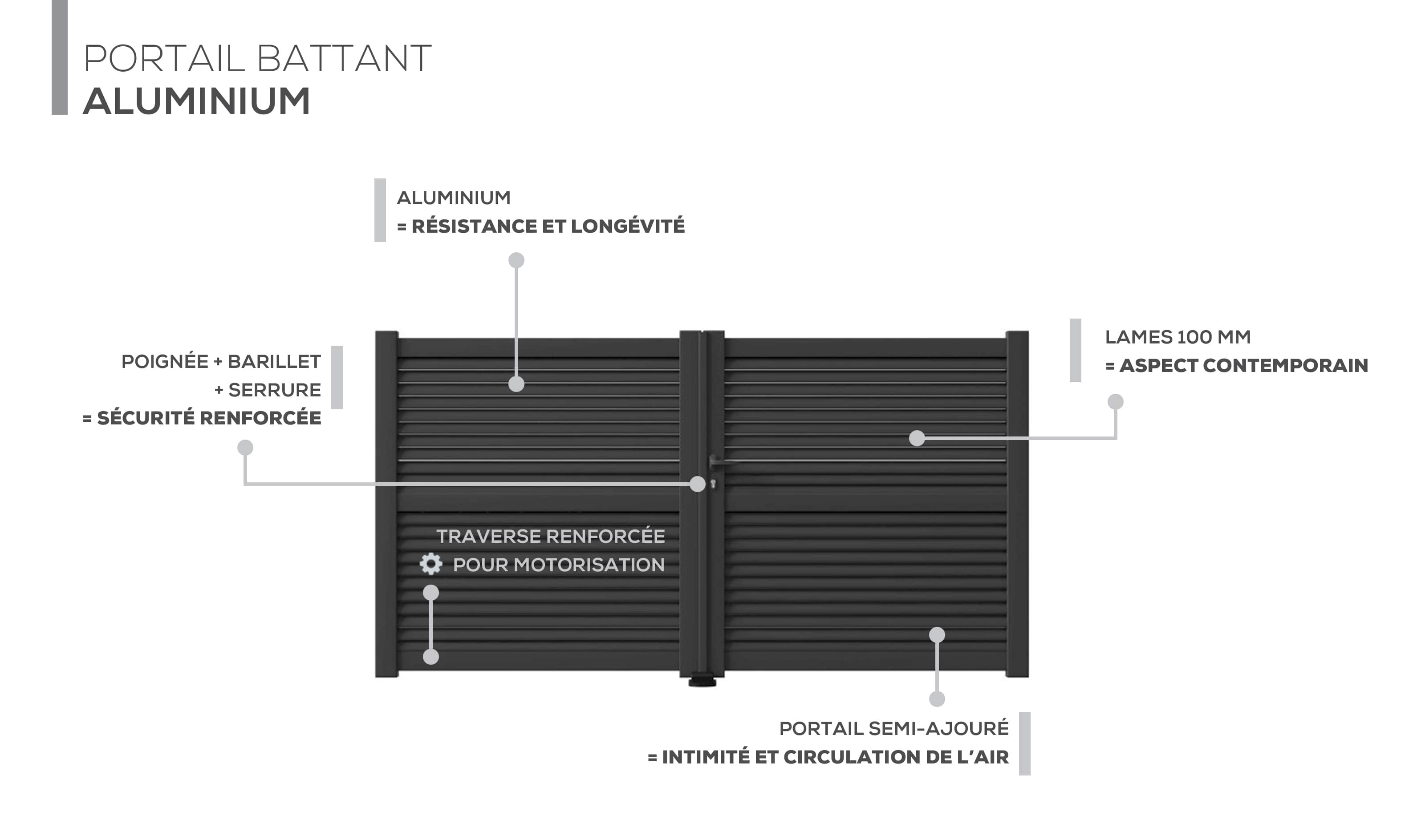 Parfait pour les nouvelles constructions et les projets de rénovation, ce portail battant en aluminium est une solution esthétique et fonctionnelle pour sécuriser et embellir votre entrée.