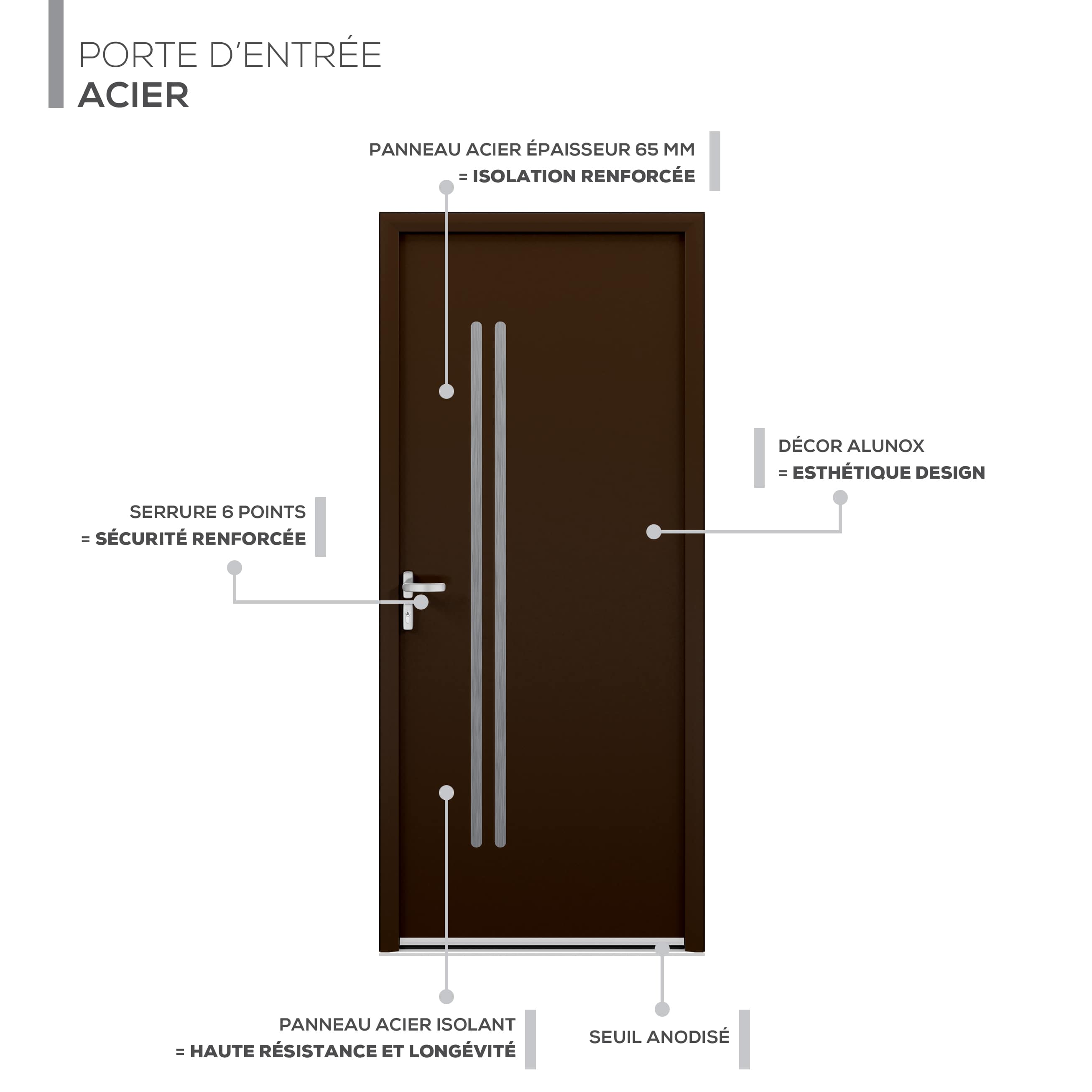 Optez pour notre porte d'entrée en acier, une solution robuste et élégante alliant performance thermique, sécurité accrue et durabilité exceptionnelle. Elle est conçue pour s’adapter à divers types de pose et offrir une intégration harmonieuse dans votre habitat.