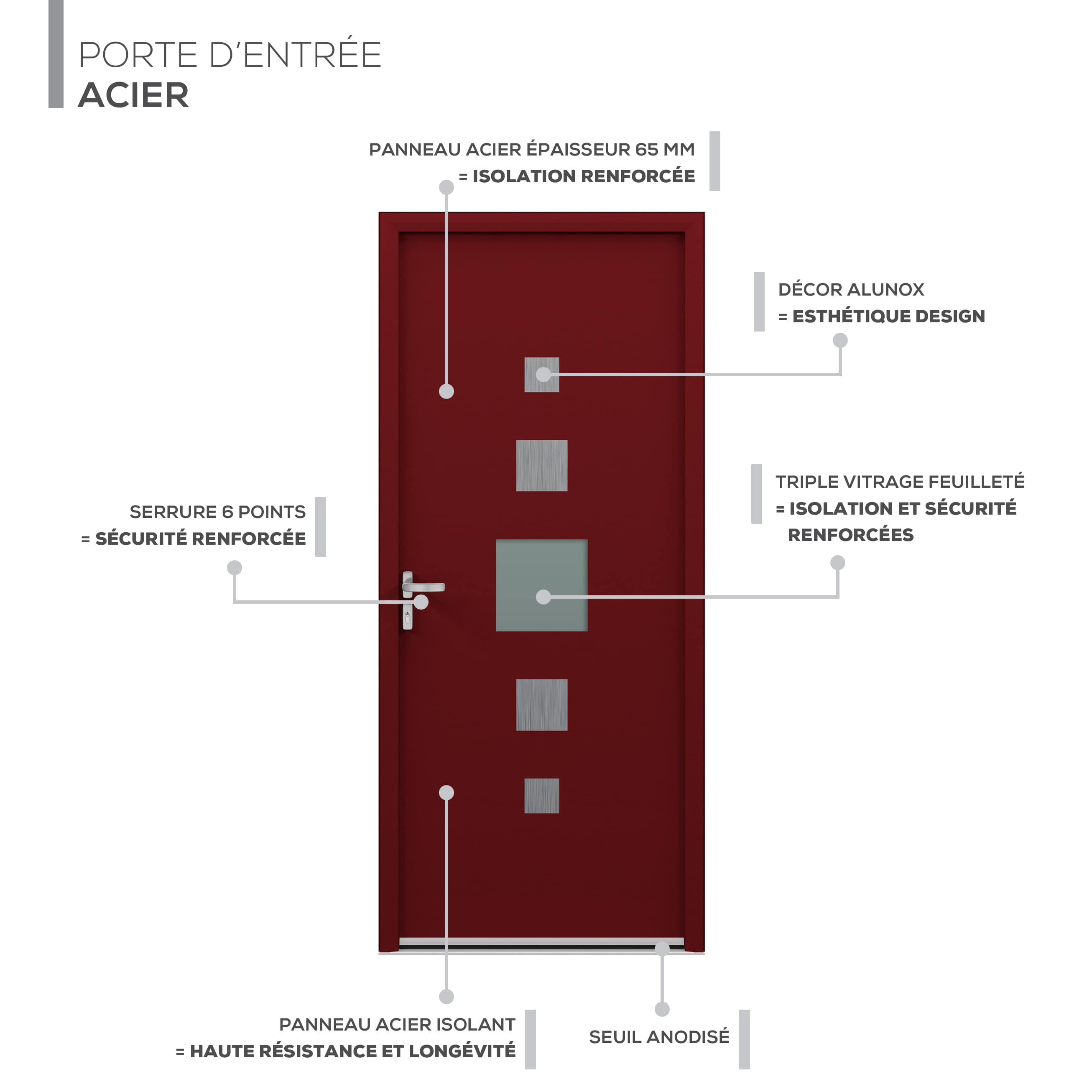 - Sécurité accrue : Serrure à 6 points pour une sécurité optimale contre les intrusions.