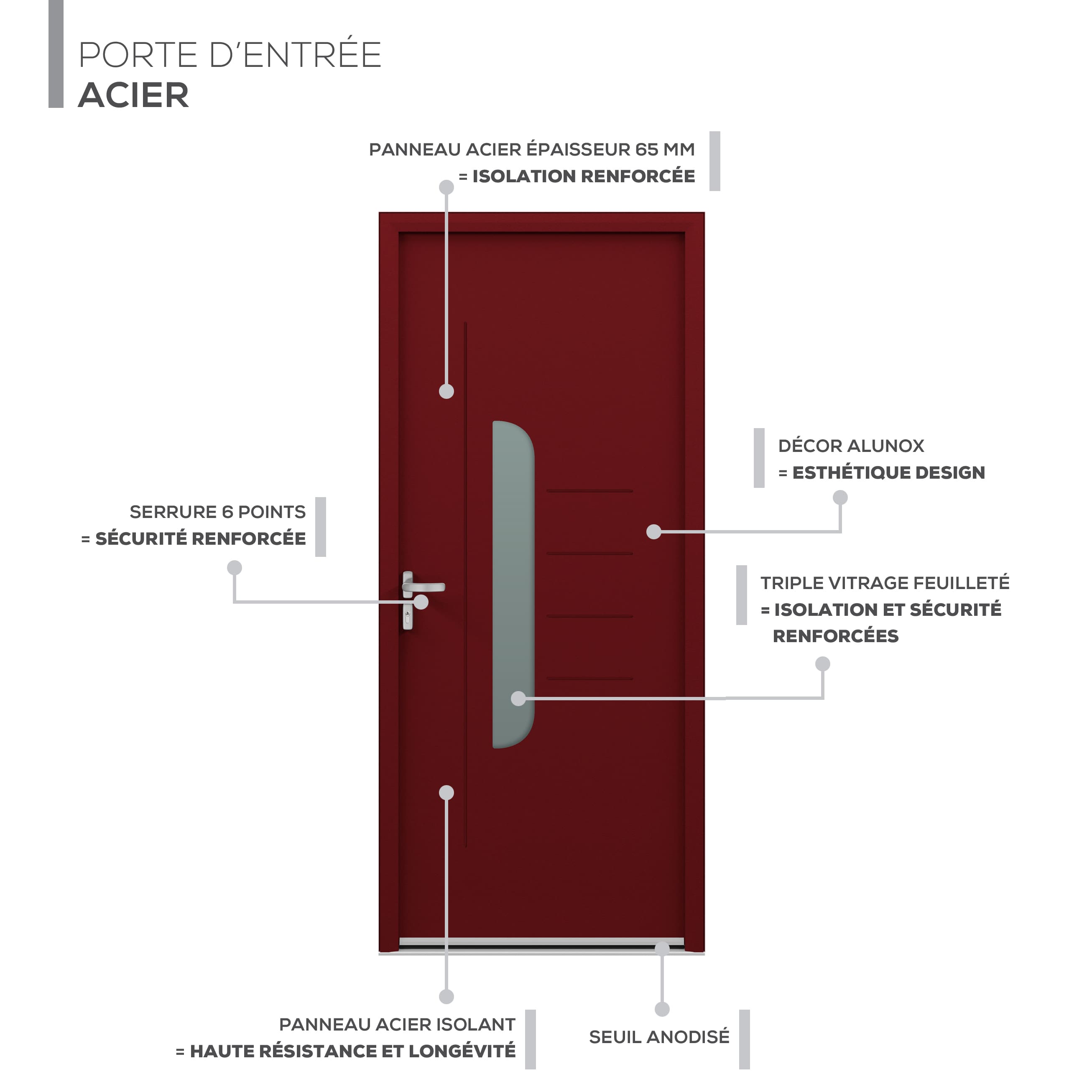 - Sécurité renforcée : Serrure à 6 points pour une protection maximale contre les intrusions.