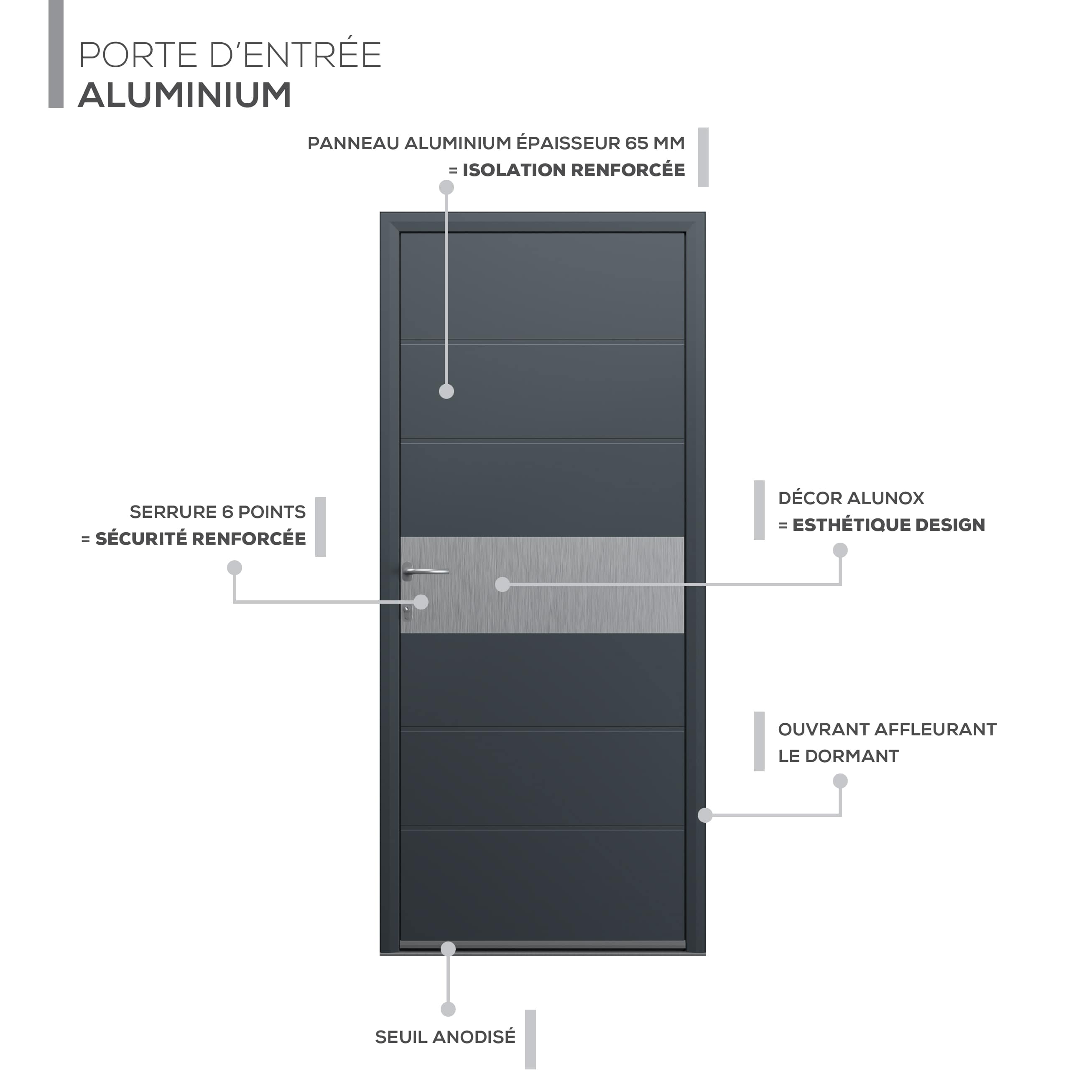 Optez pour cette porte d'entrée en aluminium, alliant robustesse, style contemporain et haute performance thermique. Avec ses options de personnalisation étendues, elle s'adapte à tous les types d'habitats.