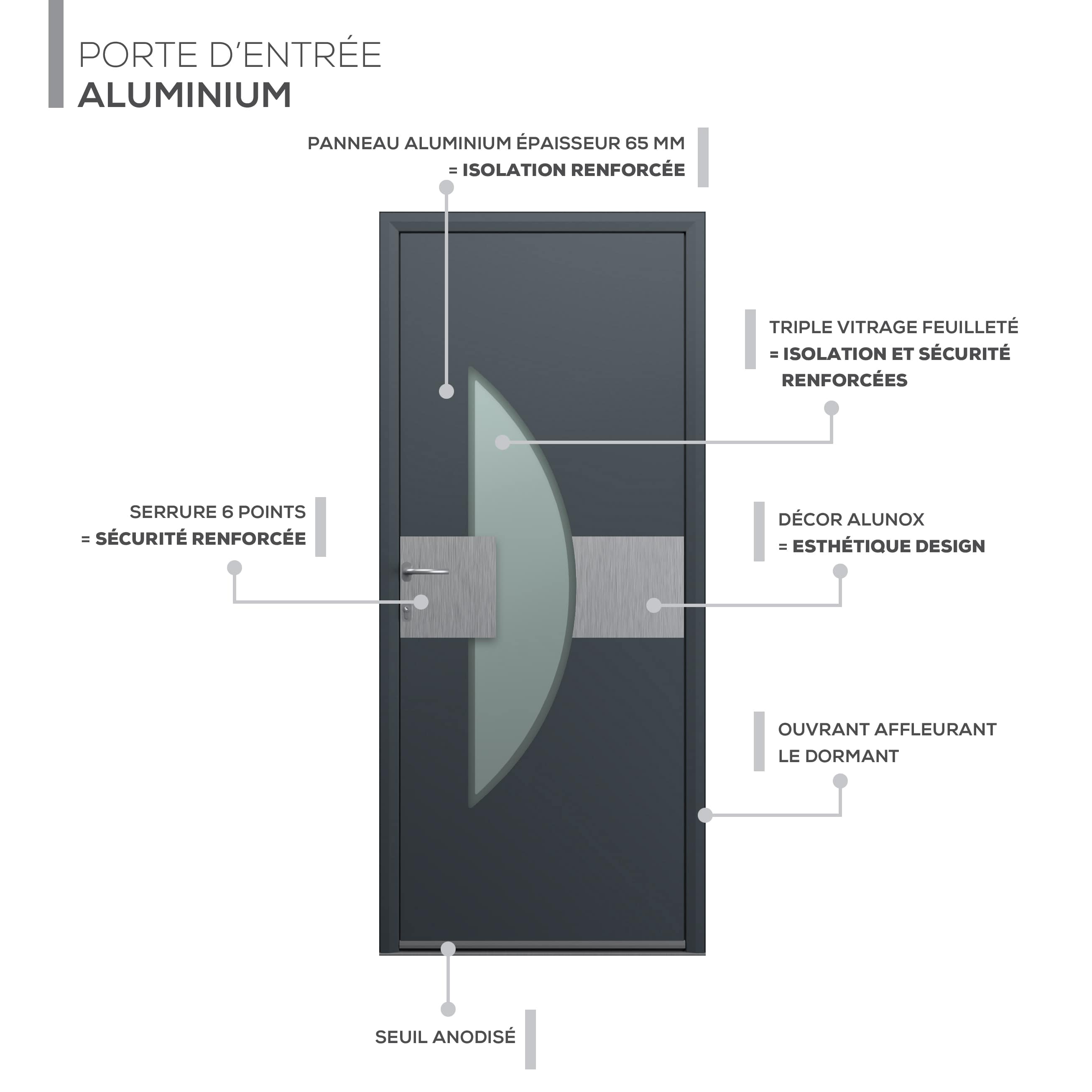 Idéale pour les projets de construction moderne ou de rénovation, cette porte d’entrée en aluminium s’intègre harmonieusement dans tout type de logement, alliant sécurité et esthétique.