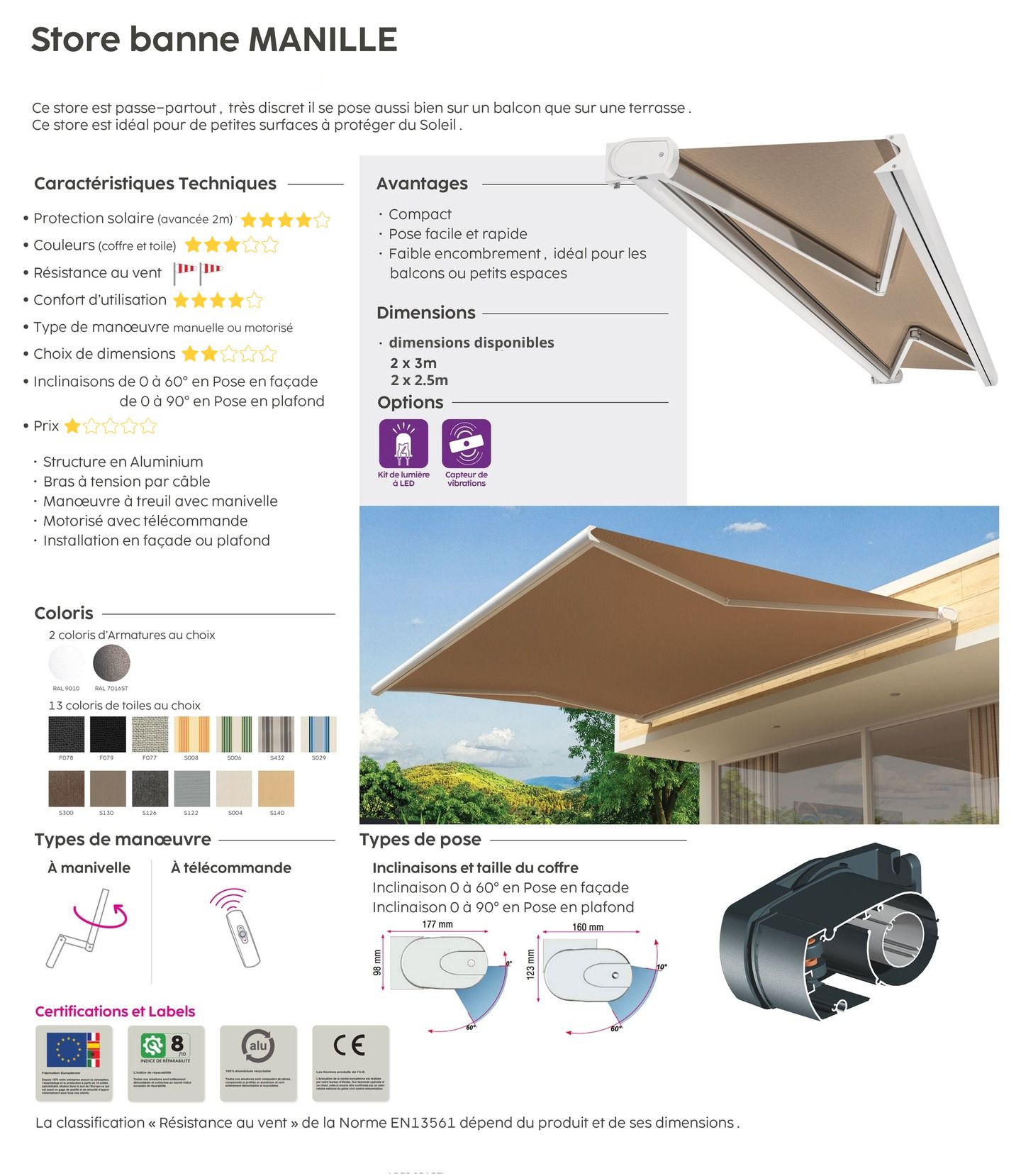 - Coloris : Choisissez parmi 13 coloris de toiles et 2 coloris d'armatures pour personnaliser votre store selon vos préférences esthétiques.