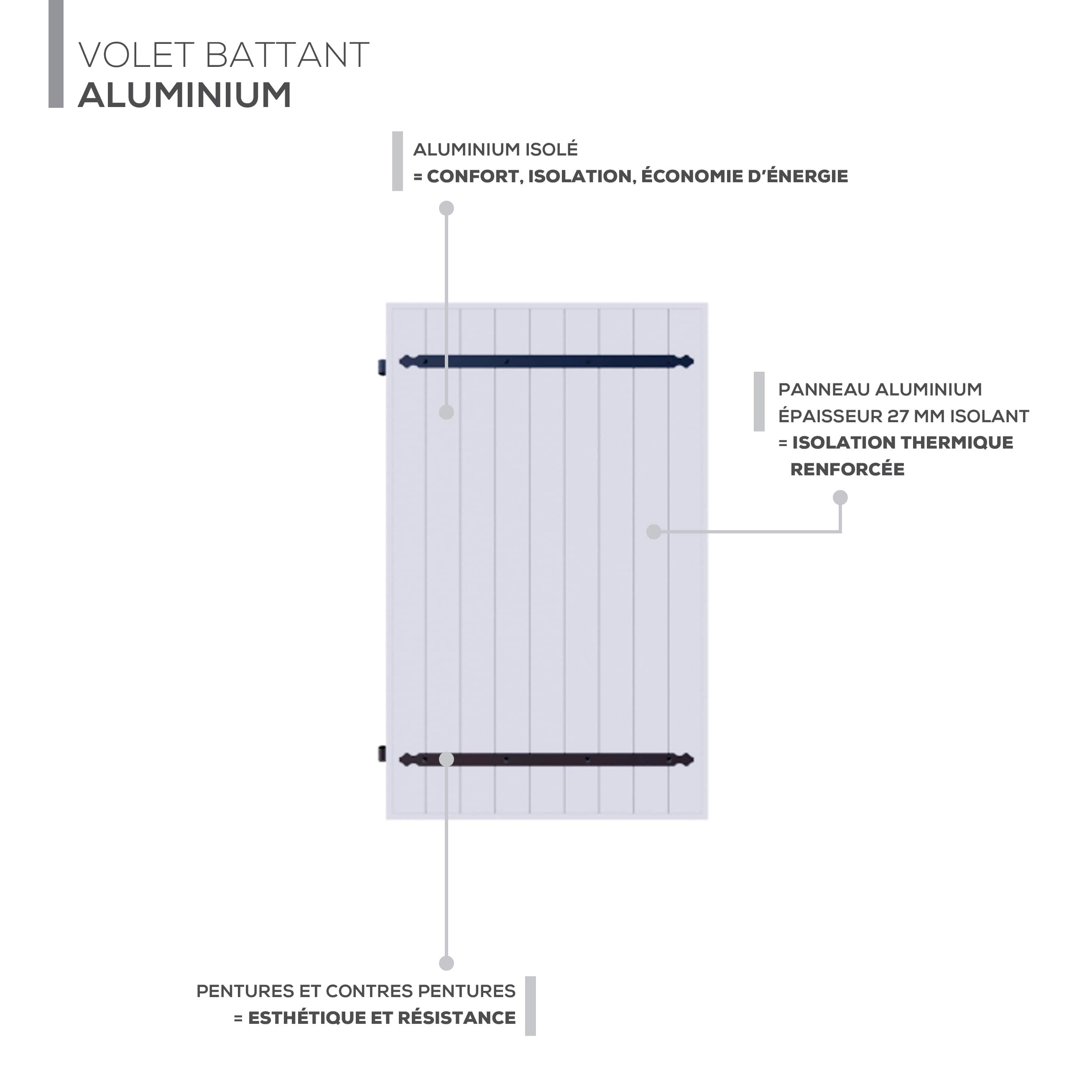 Améliorez l'efficacité énergétique de votre maison tout en ajoutant une touche contemporaine avec notre volet battant en aluminium isolé. Conçu pour résister aux éléments, ce volet offre une durabilité exceptionnelle, grâce à l'aluminium, un matériau insensible à la corrosion et nécessitant peu d'entretien. Il est également doté d'une mousse isolante pour mieux conserver la chaleur à l'intérieur de votre habitation.