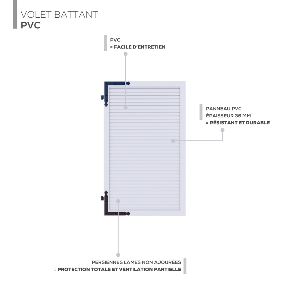 Optez pour une protection maximale avec notre volet battant en PVC épaisseur 36 mm, modèle Persienne à lames non ajourées. Ce volet assure une parfaite occultation tout en offrant une durabilité exceptionnelle.