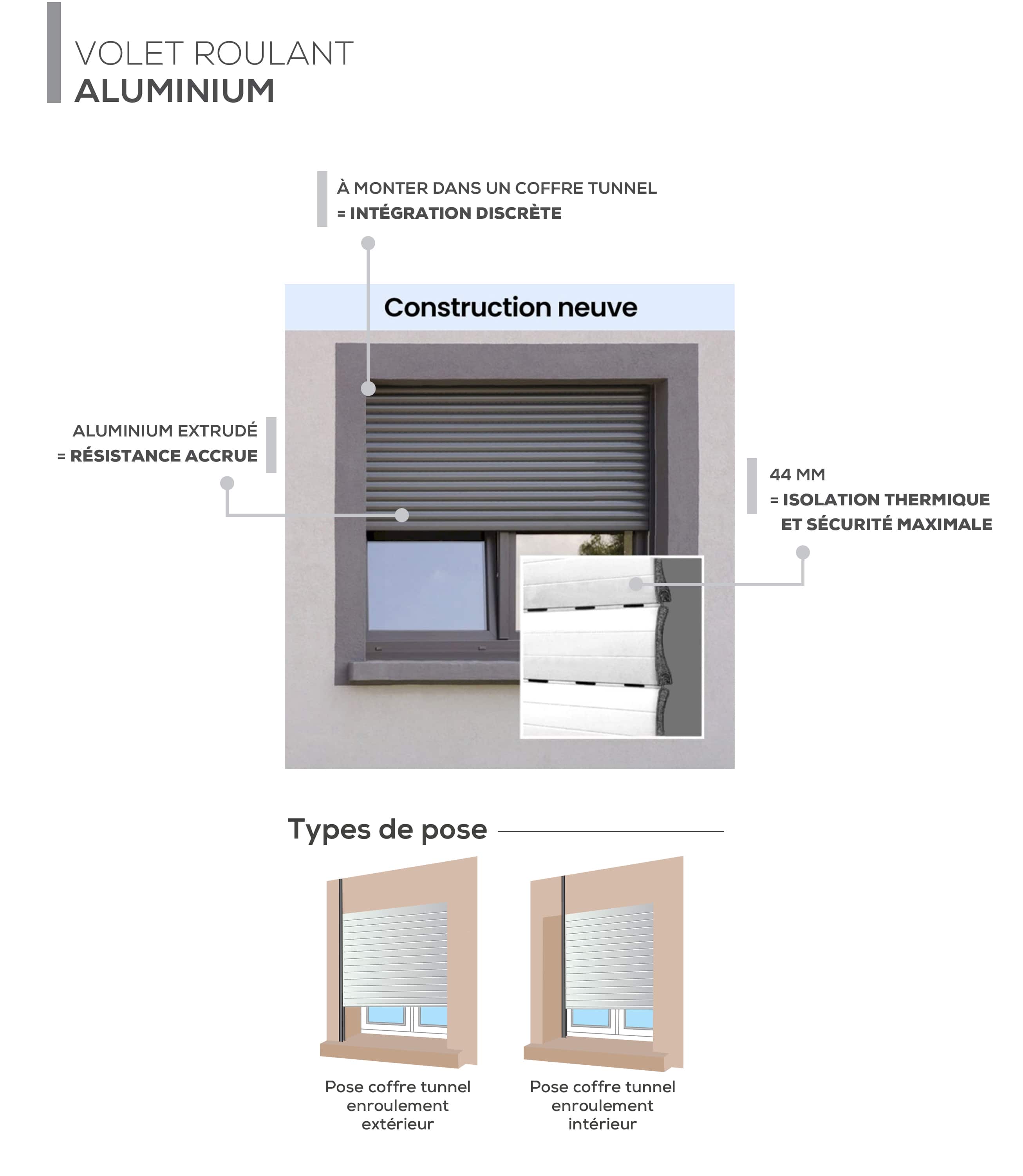 Ce volet roulant est particulièrement adapté pour les constructions neuves avec coffres tunnel installés. Il est également idéal pour ceux qui recherchent une solution esthétique et fonctionnelle pour leurs ouvertures, offrant à la fois une performance thermique optimale et un design épuré.