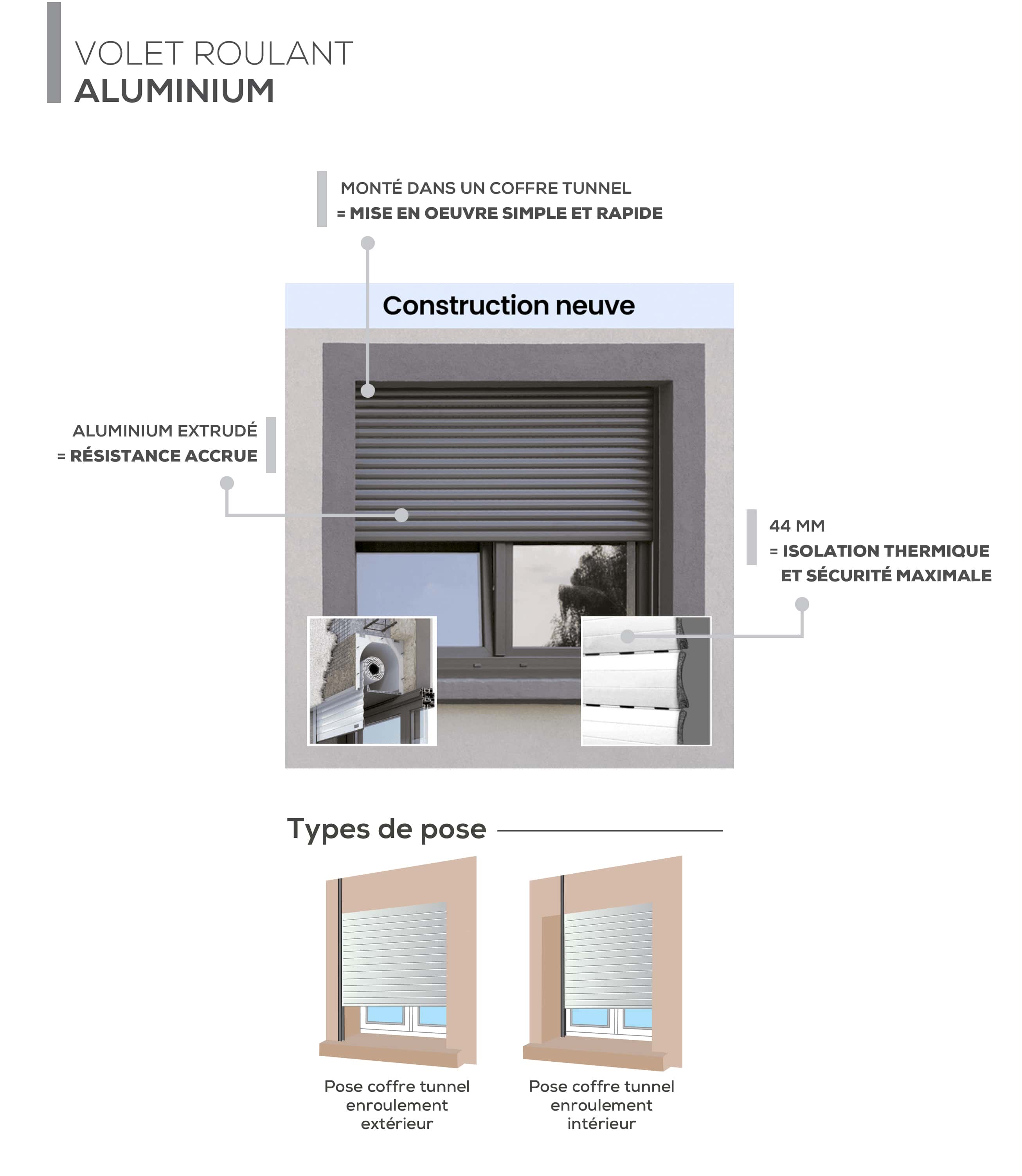 Ce volet roulant est parfait pour les nouvelles constructions, avec une intégration discrète dans un coffre tunnel. Il est particulièrement adapté pour ceux qui recherchent une solution à la fois fonctionnelle et esthétique pour leurs ouvertures.