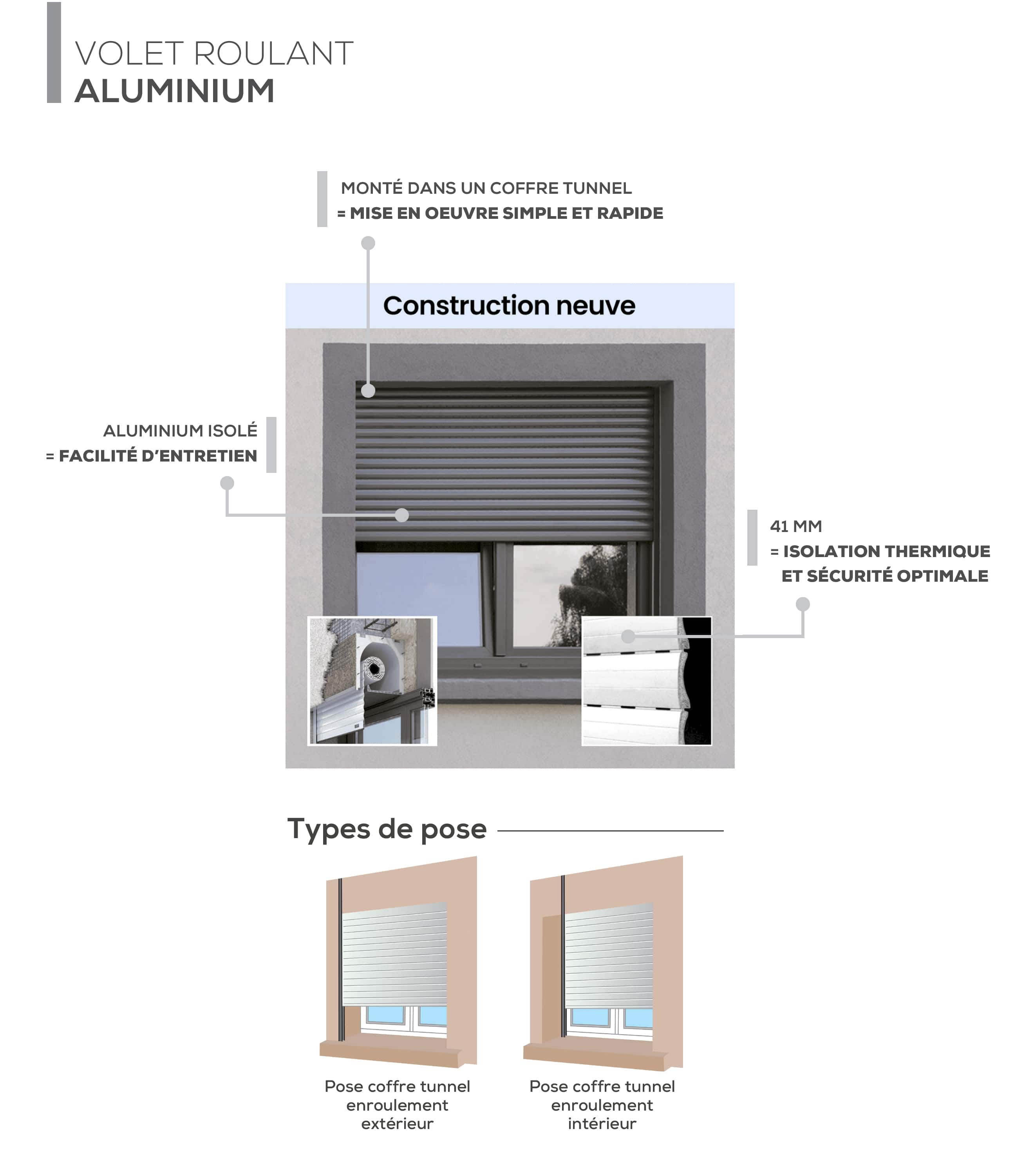 Ce volet roulant est parfait pour les constructions neuves où le coffre tunnel a déjà été installé. Sa conception pratique assure une pose simplifiée et une efficacité thermique accrue.